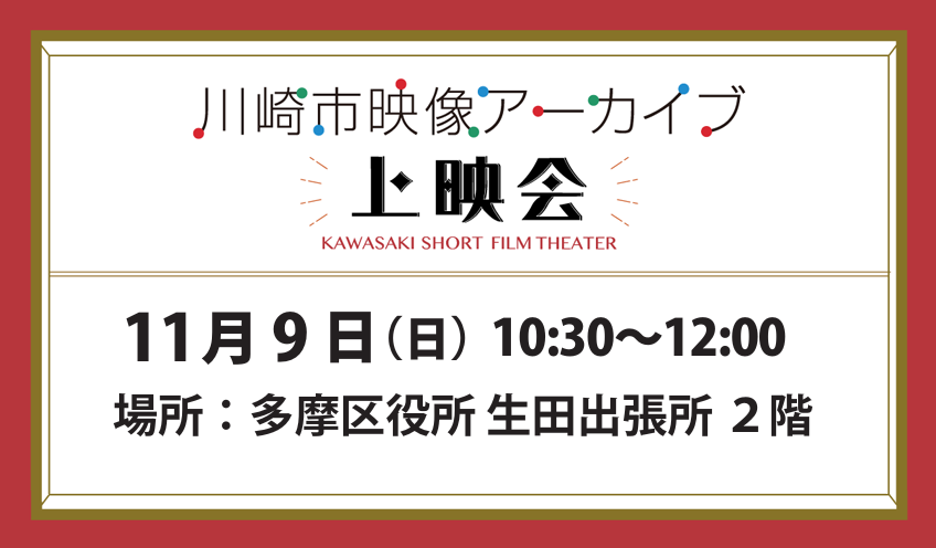 2025年11月9日(日) 多摩区役所 生田出張所にて「川崎市映像アーカイブ上映会」を行います。 多摩区を中心とした川崎市の懐かしい映像の数々をお楽しみいただけ…