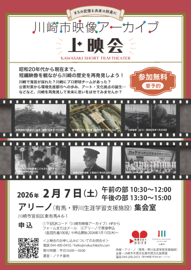 2026年2月7日(土) アリーノ(有馬・野川生涯学習支援施設)にて川崎市映像アーカイブ上映会を行います。