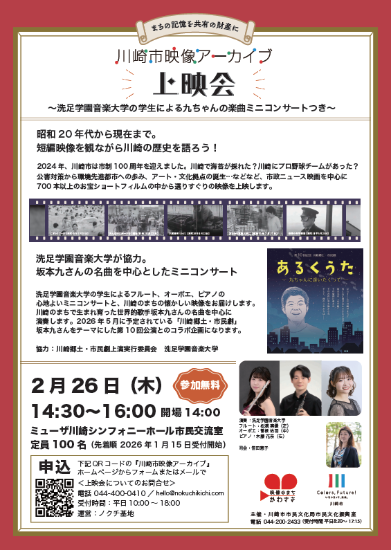 2026年2月26日(木) ミューザ川崎シンフォニーホールにて『川崎市映像アーカイブ上映会』を開催します。洗足学園音大生によるフルート、オーボエ、ピアノの心地よいミニコンサートと、川崎のまちの懐かしい映像をお届けします。川崎のまちで生まれ育った世界的歌手坂本九さんの名曲を中心に演奏します。2026年5月に予定されている「川崎郷土・市民劇」坂本九さんをテーマにした第10回公演とのコラボ企画になります。