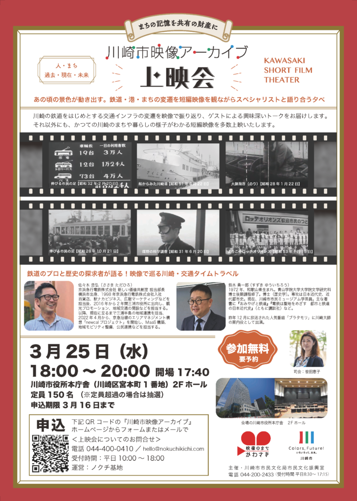 川崎の鉄道をはじめとする交通インフラの変遷を映像で振り返り、ゲストによる興味深いトークをお届けします。それ以外にも、かつての川崎のまちや暮らしの様子がわかる短編映像を多数上映いたします。